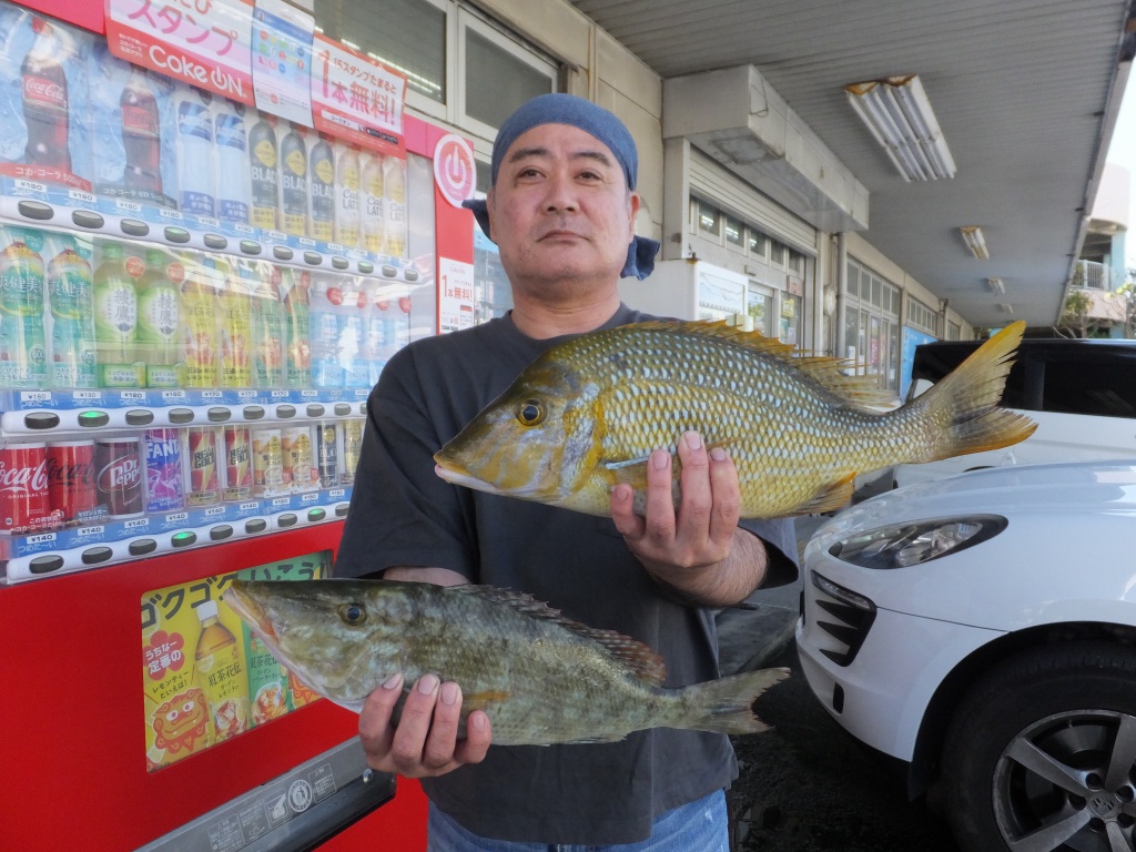 名前:渡名喜 しゅんえいさん 魚種:ウムナガー タマン 全長:46.5p 45.6p 重量:1.16s 1.39s 釣場:知念海岸(那覇店検量) |