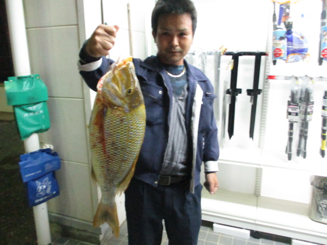 名前:上原 市郎さん魚種:南黒鯛 全長:44p 重量:1.58s 他数釣り 釣場:与根海岸 検量店:南風原店 |