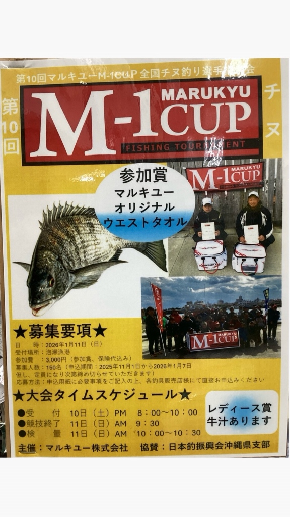 日時:2026年1月11日(日) 場所:沖縄県沖縄市泡瀬漁港(本部設置場所) 参加費:3000円(参加賞、保険代込み/大会当日不参加の場合は返金出来ません) 応募人数:150名申込期間:2025年11月1日(土)から2026年1月7(水) 応募方法:申込用紙に必要事項をご記入の上、参加費と一緒に各釣具販売店様にお申し込み下さい。